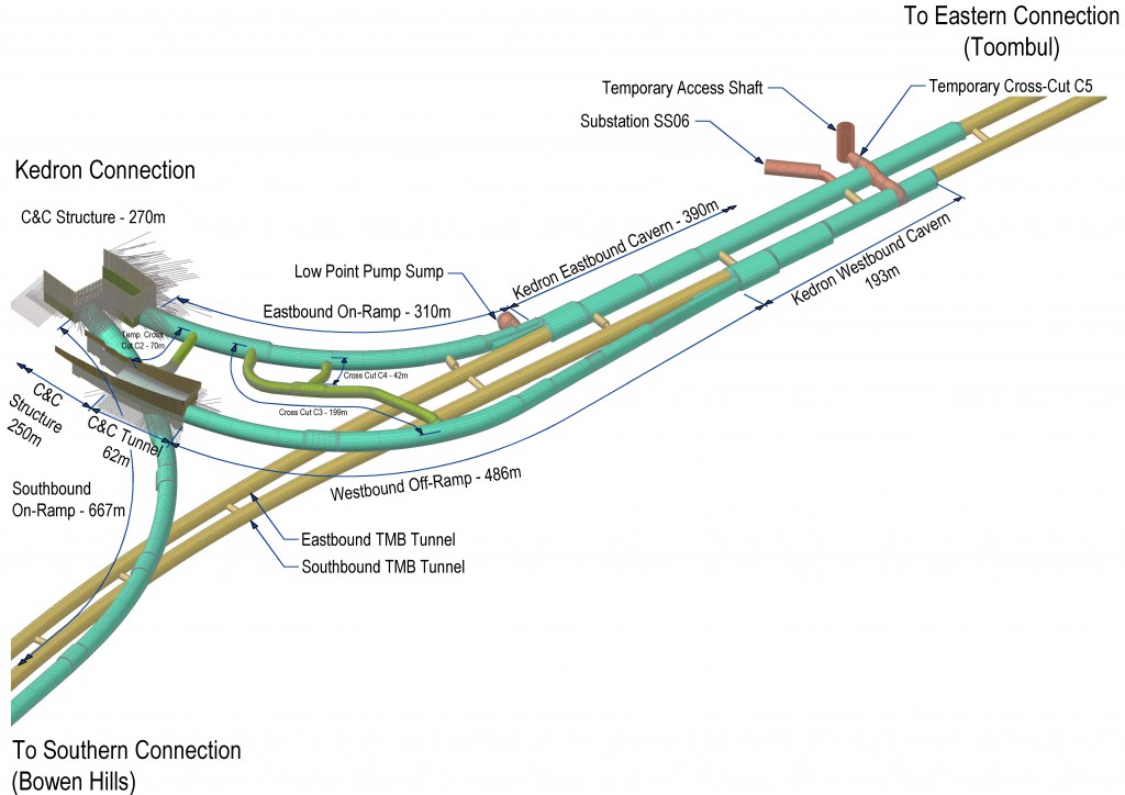 - Elevated ramps linking the tunnel to existing roadwork and Clem 7 tunnel (Southern Connection at Bowen Hills)
