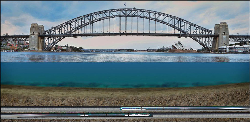 - Twin 15.5 kilometre tunnels from Chatswood to Sydenham travelling under Sydney Harbour and the CBD using five tunnel boring machines (TBMs).