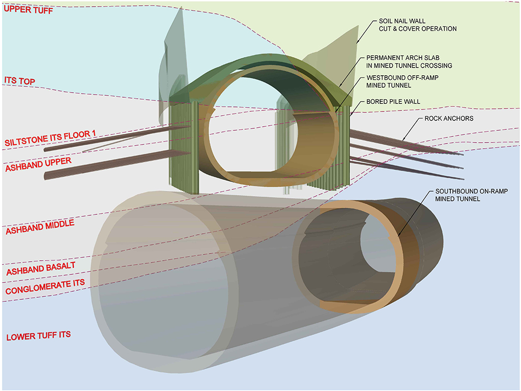 - Design of mined tunnel including 3D modelling of Westbound off and Southbound on-ramps with cut & cover structure TW930